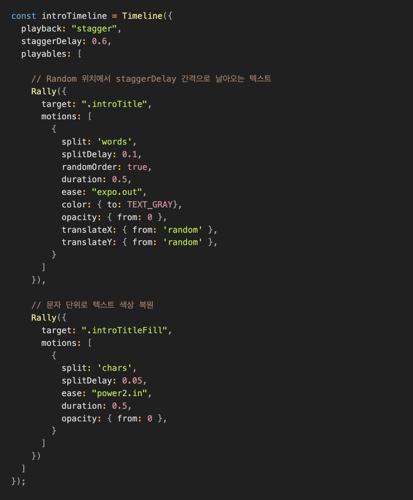 인터렉션 시스템은 Timeline, Rally, Motion으로 구성됩니다. 모션에 split 프로퍼티를 설정함으로써 태그를 word, char, line 단위로 Split 쪼갤 수 있는데, 이미 word 단위로 쪼개져 날라온 텍스트를 다시 char 단위로 색을 채우기는 쉽지 않았습니다. 따라서 날아온 글자와 같은 위치에 있는 텍스트의 opacity를 풀어주는 방식으로 눈속임 효과를 주었습니다.