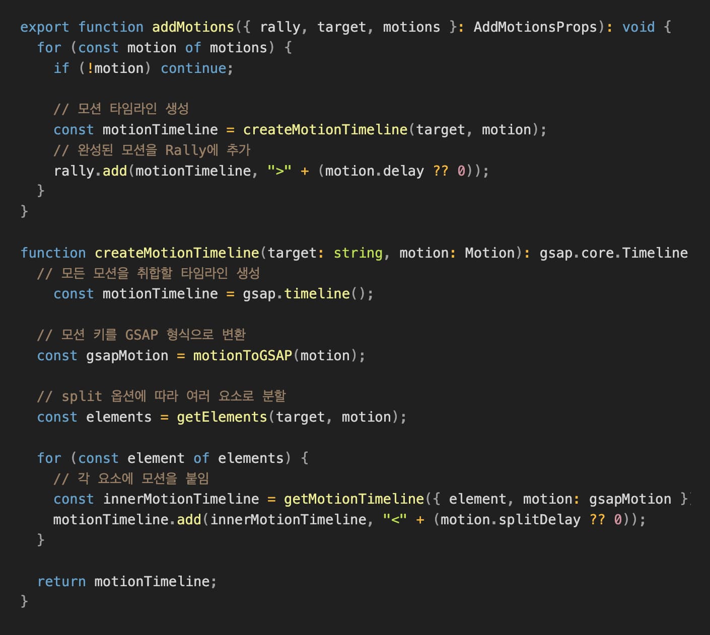 모션은 가장 구현하기 까다롭고, for 문을 많이 돌아 성능적으로도 많이 아쉬움이 남았습니다. 먼저 translateX와 같은 프로퍼티의 키를 GSAP 키에 맞게 바꿔 타겟에 붙여주었습니다. 애니메이션은 GSAP의 fromTo 메서드를 사용했는데 사용자가 from, to 중 하나의 값만 설정해도 나머지 값을 계산할 수 있도록 previousValue 객체를 만들어 저장하였고, previousValue 값 마저 없다면 Default 값을 사용했습니다. 또한 프로퍼티마다 별도의 easing과 duration 설정할 수 있기 때문에, 프로퍼티별로 inner 타임라인을 생성한 뒤 상위의 모션 타임라인에 합쳐주었습니다.