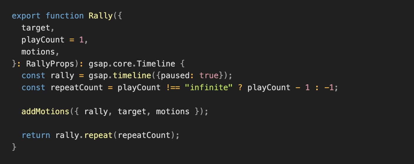 Rally는 타겟과 모션이 결합된 개념입니다. 처음에는 Rally가 tween이라고 생각했는데, 여러 모션을 실행하고 반복할 수 있어야 하기 때문에, 하나의 Timeline이라는 생각이 들었습니다. 처음엔 split 관련 부분을 Rally에서 처리했는데, 이후 같은 타겟에 대해 다르게 split 하고 싶어서 motions의 프로퍼티로 옮겼던 것이 아마도 실수였다는 생각이 듭니다.