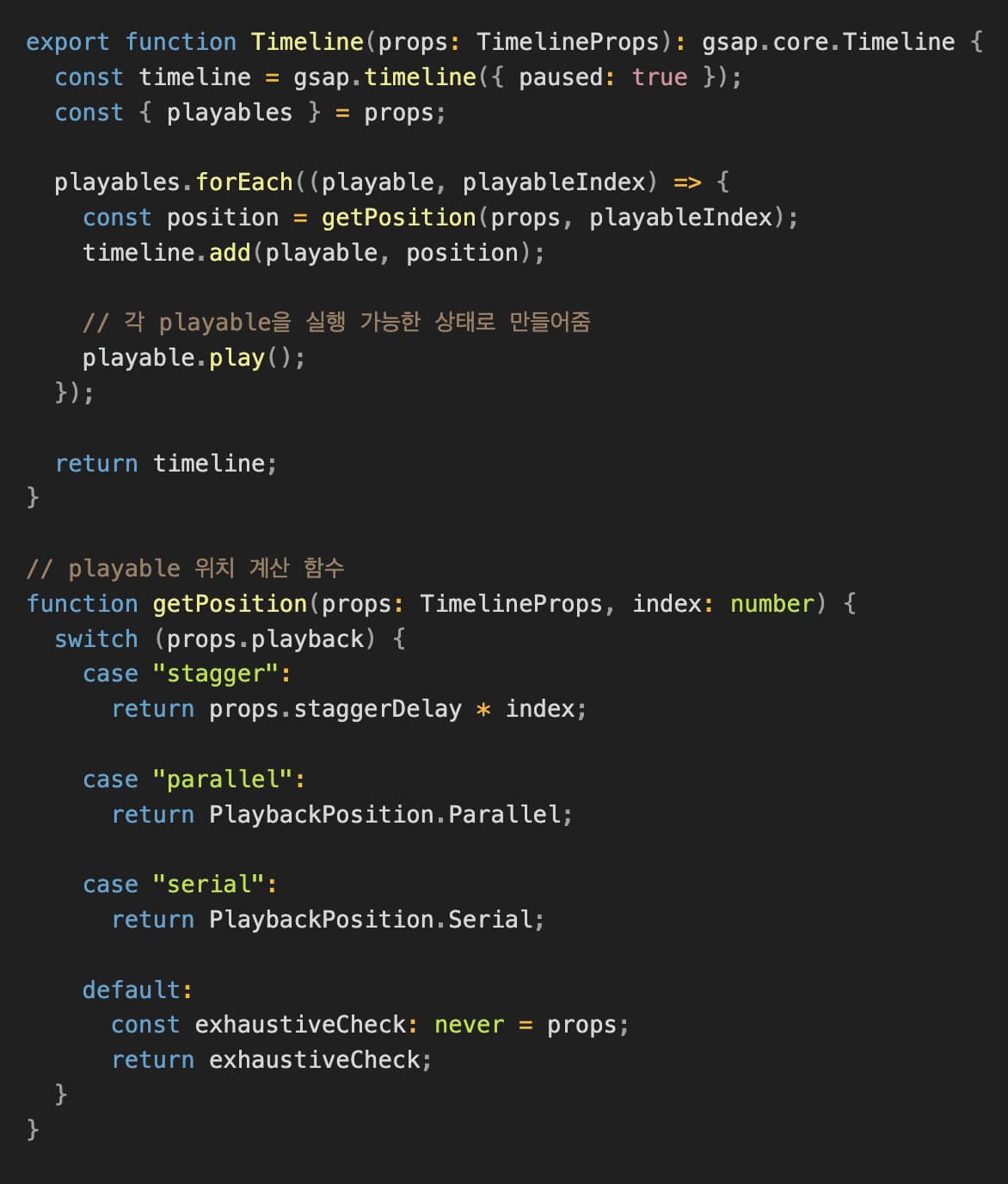 Timeline은 playback을 통해 실행 방식을 결정하고, playables 배열로 받은 Rally와 다른 Timeline을 실행합니다. 정지 상태로 생성된 playable을 실행 가능한 상태로 바꿔주었습니다.